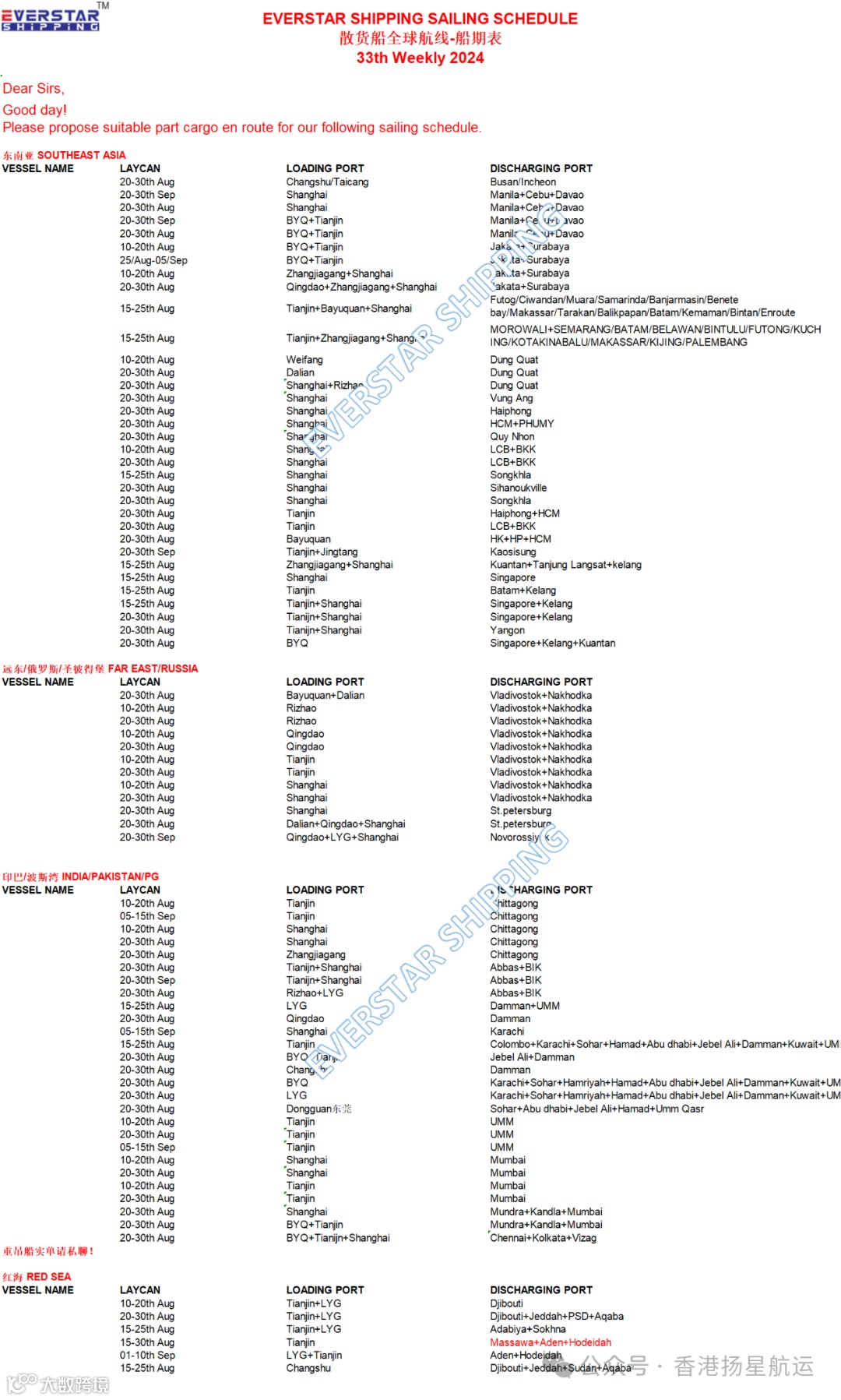 2024年8月大中华区散杂船期表(第33周)东南亚,远东波斯湾红海 - SAILING SCHEDULE 香港扬星航运