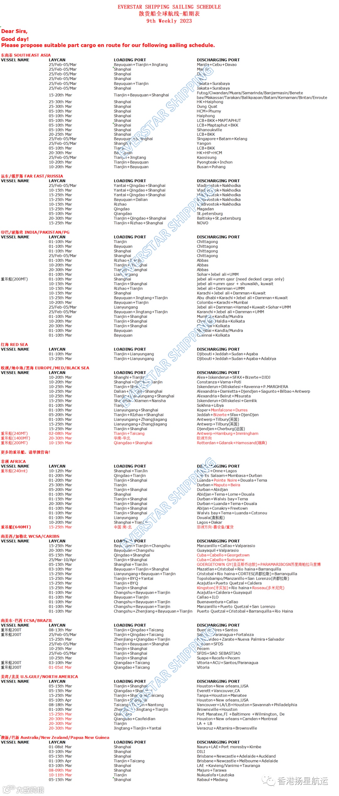 2月大中华区散杂船期表(第9周) - SAILING SCHEDULE 香港扬星航运