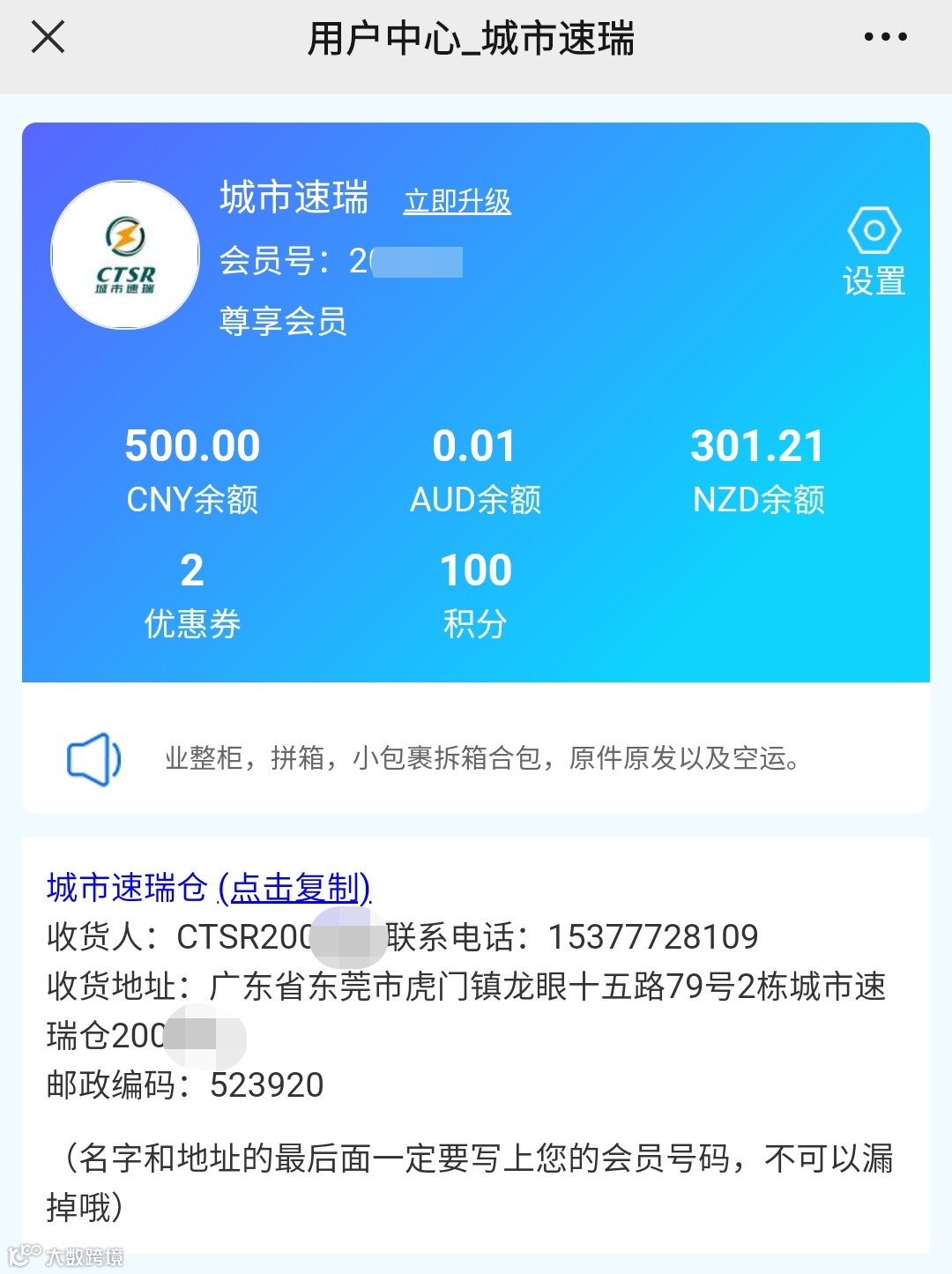 可能出现的问题,如果您一直使用城市速递的旧系统,也曾经关注过速瑞集运但没有注册过,那么您关注新系统公众号之后,会要求再重新注册一回,注册好之后会显示您曾经关注的速瑞集运的会员号,城市速递的会员号作为子会员号将不再显示。