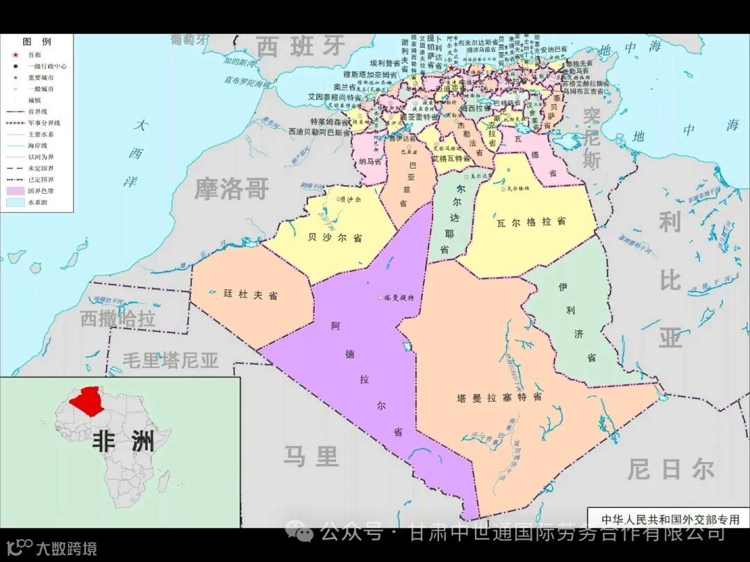 阿尔及利亚位于非洲西北部,陆地面积238.17万平方公里,居非洲、地中海和阿拉伯国家之冠,排全球第10位。北邻地中海,北部为地中海岸的滨海平原,属地中海气候,冬季温和多雨,湿度为80%,夏季炎热干燥,湿度为60%,年降水量在400至1000毫米之间,年平均温度17℃。南属撒哈拉马格里布沙漠,属于热带沙漠气候。中部为阿特拉斯山地高原,属于热带草原气候与高原气候。东邻利比亚、突尼斯,西部与摩洛哥、西撒哈拉交界。首都阿尔及尔。截至2019年,阿尔及利亚总人口约4305.31万,其中阿拉伯人约占总人口的80%,柏柏尔人约占总人口的20%。人口与经济主要集中在阿尔及利亚北部沿海地区。