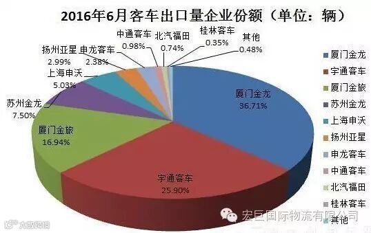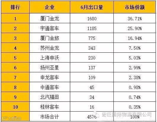 2016年6月份,中国累计出口客车4576辆,占据整个客车市场总销量18.32%的份额。具体排名如下: