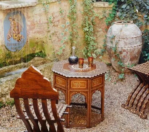 利用先在胡桃木上挖出凹槽,然后镶嵌贝壳的传统手工艺方法做成的八角木几,上面摆放的托盘、玻璃杯和台灯,都是典型的摩洛哥风格。