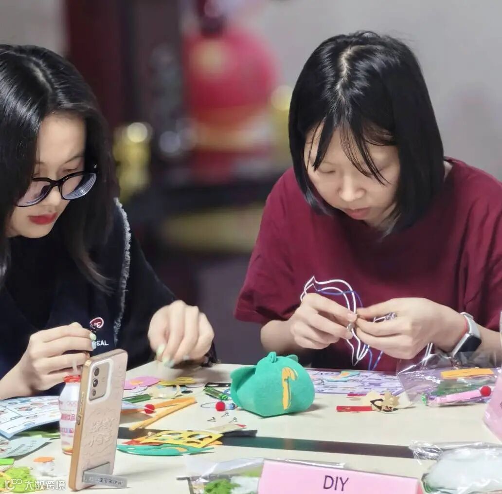 DIY活动现场,各式端午元素的手工材料铺满长桌,艾草香囊、养身锤、迷你龙舟、粽子挂件……