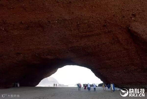 没错,这是在摩洛哥,大西洋翻涌的海浪在岸边深红的崖壁上雕饰出的一座唯美的天然拱门。