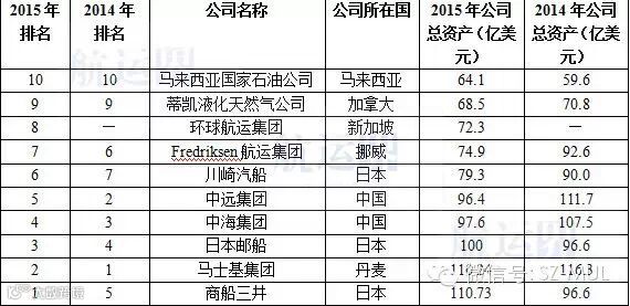 对比去年榜单发现,各船公司的总资产较去年都有缩水,但亚洲船公司依然占据半壁以上江山,可见亚洲航运业在全球的地位。去年未列入前十名的新加坡环球航运(BW Group)今年荣膺第8名,这家公司现在由华人世界船王包玉刚先生的外孙苏包文刚担任主席。蒂凯液化天然气公司和马来西亚国家石油公司排名未发生变化,而去年排名8名的天蝎座(Scorpio)跌出前10名。日本商船三井则成为资产上升最快的公司。