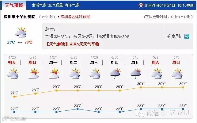 昨日白天,鹏城以阴天间多云天气为主,天气清爽舒适,最高气温24℃。市气象台预测,未来几日我市多云间阴,天气舒适;26日起阳光增多,中午前后渐趋炎热。