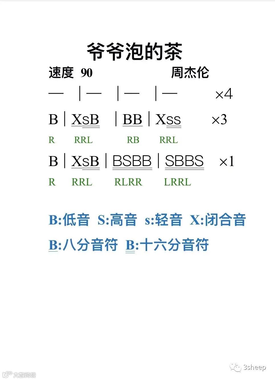 本节课是一首周杰伦的《爷爷泡的茶》。节奏以前八后十六和十六分音符为主。建议在刚开始练主节奏和加花节奏的过程中跟着节拍器慢速练习。
