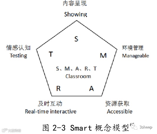 艺术教育培养学生的形成文明意识,提高创造力,学会与外界的交流与沟通的能力。在艺术教育对于学生智力的开发以及创造力的培养是非常重要的,应重视学生创新思维能力的培养。传统的艺术教学大都是采用 PPT 来呈现教学内容,这种呈现方式并没有考虑到学生的接受程度,学生也没有在课堂上获得好的审美体验,妨碍了学生思维能力的发展。教学方式的落后不仅仅限制了学生的想象力,而且在一定程度上削减了学生学习的兴趣,学生无法在课程中获得审美的体验,更不能将情感投入课堂,思维空间也被限制。智慧课堂的智能化在教学内容的呈现、学习资源、课堂教学的互动等方面展现了智能环境下教学的优势。此外,在情境感知、课堂布局、管理等也为艺术教师的教学提供了技术支持。智慧教室的智能化教学可以概括为以下五个维度:教学内容的呈现(Showing)、教学环境的管理(Manageable)、教学资源资源获取(Accessible)、实时互动(Real-time Interactive)、情景的感知(Testing)。以上五个维度 S、M、A、R、T,五个维度体现了智能化课堂的优势与特点,被称为 Smart 概念模型。64如图 2-3 所示。