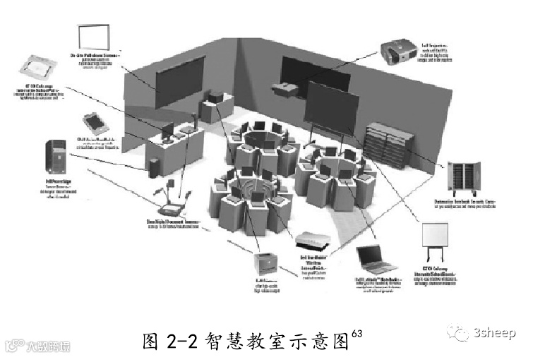 目前在智慧教室的概念上存在许多的说法,文献资料显示也各有不同,综合国内外各项关于智慧教室的研究,认为智慧教室是一种方便师生获取学习资源来进行教与学活动。便利地控制和操作互联网、视听、投影、计算机、交互式白板等设备,适应多种线上教学,能够实现现实与虚拟相结合的智能环境。62如图 2-2 所示。