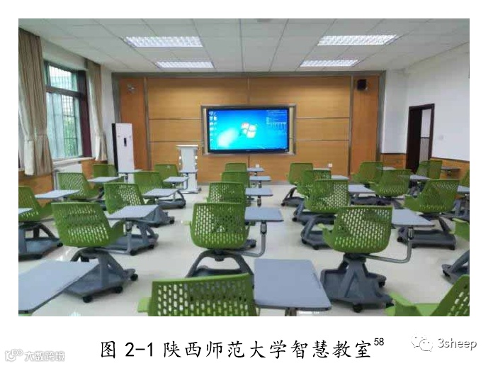 互联网时代下 ICT 不可避免的进入到社会的各个领域,ICT 既是一种技术手段,又是一种教学手段,与传统教学方法相比,这种与 ICT 相融合的艺术教学方法能够在一定的程度上调动学生的积极性。智慧教室是网络时代下一种典型的学习环境,是当今智慧学习的必然选择,2017 年 10 月 14 日刊登的《中国教育报》中第 3 版处有这么一篇文章,题目为信息技术“点燃”激情飞扬的课堂,这篇文章讲解了陕西师范大学应对互联网时代对教学提出了新的要求与挑战。ICT 与艺术教育的整合是都教学模式的创新与变革,陕西师范大学在课堂教学的创新中,转变了教师与学生之间角色,学生不仅是学习的参与者更是学习的输入者,真正的意义上将学习掌控在学生手中。陕西师范大学在互联网时代下,利用互联网的优势建立了智慧教室。从教室的配置来看,彻底改变了教师原有的模样,智慧教室不仅有可移动的桌椅,并且这些桌椅还可以自由的组合,以方便学生们的小组写作与讨论;黑板早已不再是用粉笔进行书写的传统黑板,而是触摸屏的一体机,教师可以在触摸屏上随意书写,并且擦除,再也不用忍受粉尘的烦恼了;各种移动设备都可以与一体机相互连接,教师的教学也不再局限于讲台、黑板,而是在每个同学的手中,扩大到整间教室。如图 2-1。