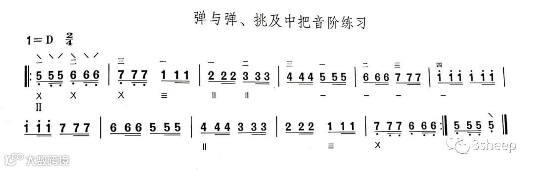 2、前半拍为八分音符,后半拍为两个十六分音符时,一般用弹与弹挑。