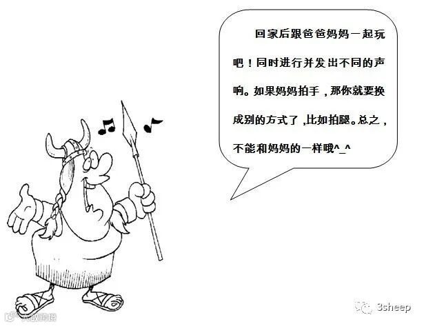 2、请小朋友用不同的方式表现出这些节奏,比如拍手、拍腿、跺脚、拍地板等任何可以发出声响的方式来完成这一作品。