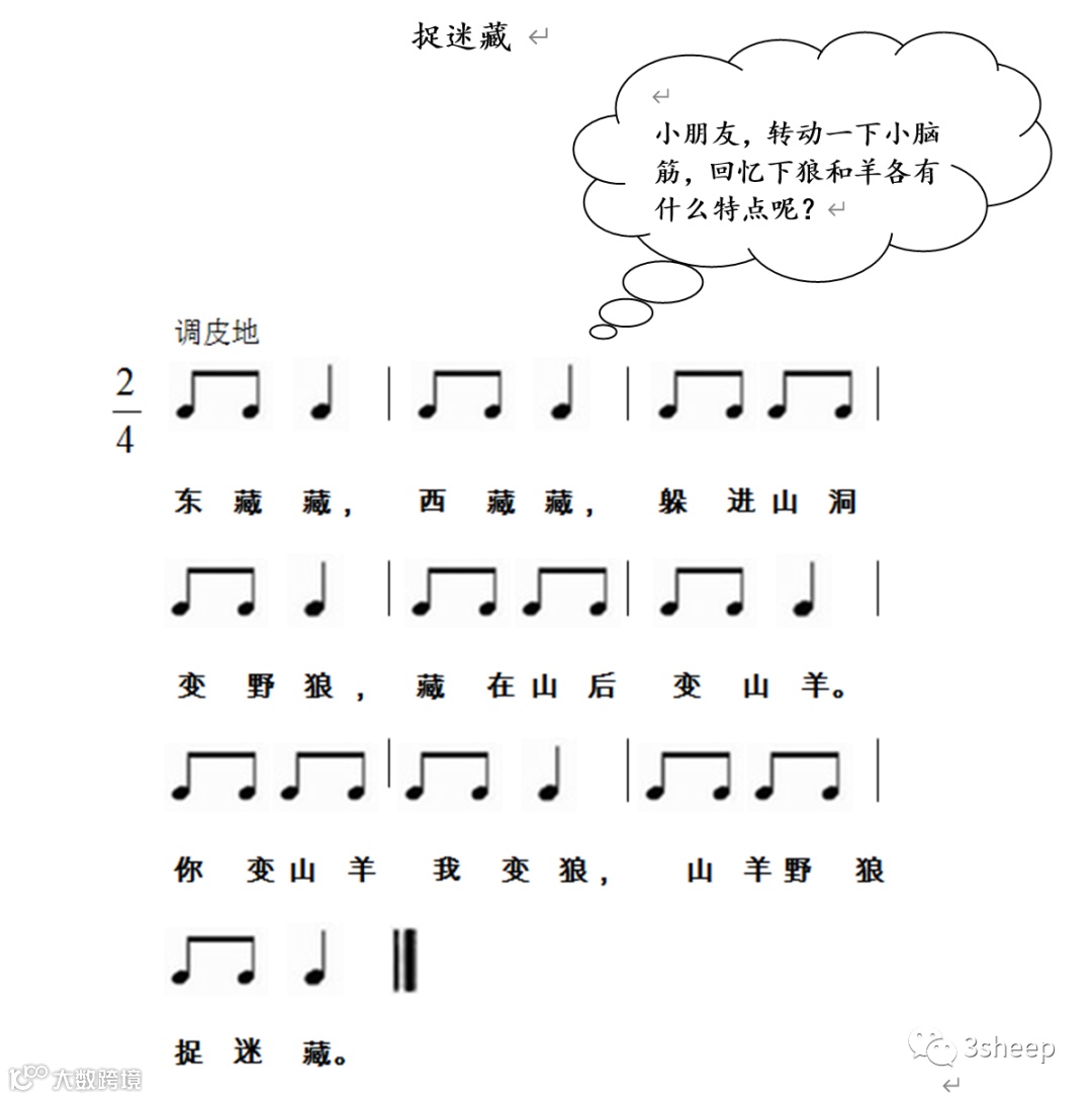 3、引导儿童将狼和羊的叫声特点与2/4拍的节拍感相联系。(见图3-9)