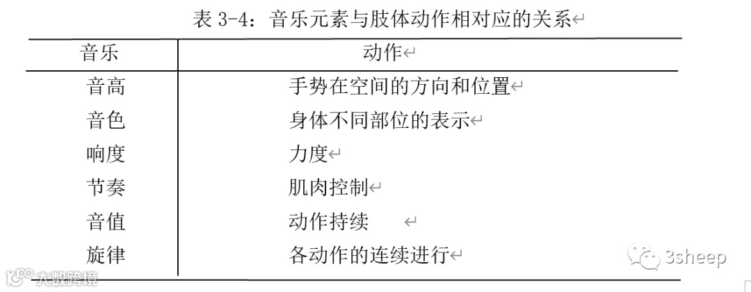 在音乐与动作课程中,音乐的一些元素(如音高、音色、响度、节奏、时值、旋律等)可以通过个体的动作加以表达,即音乐元素与肢体动作之间存在着相对应的关系,这种关系如表3-4所示: