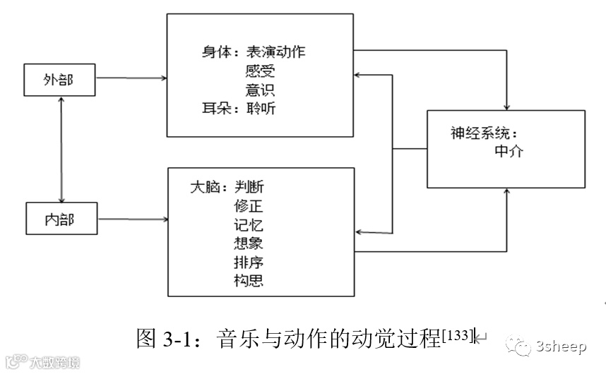 “音乐与动作”课程将听觉和运动觉联系起来。通过音乐引发动作,动作能够激发情绪和情感,情绪、情感和动觉信息传递到大脑,大脑的指令经由神经系统返回到肢体。在这个过程中,身体对音乐的动作表达和大脑对音乐的内部反应同时得到了发展。