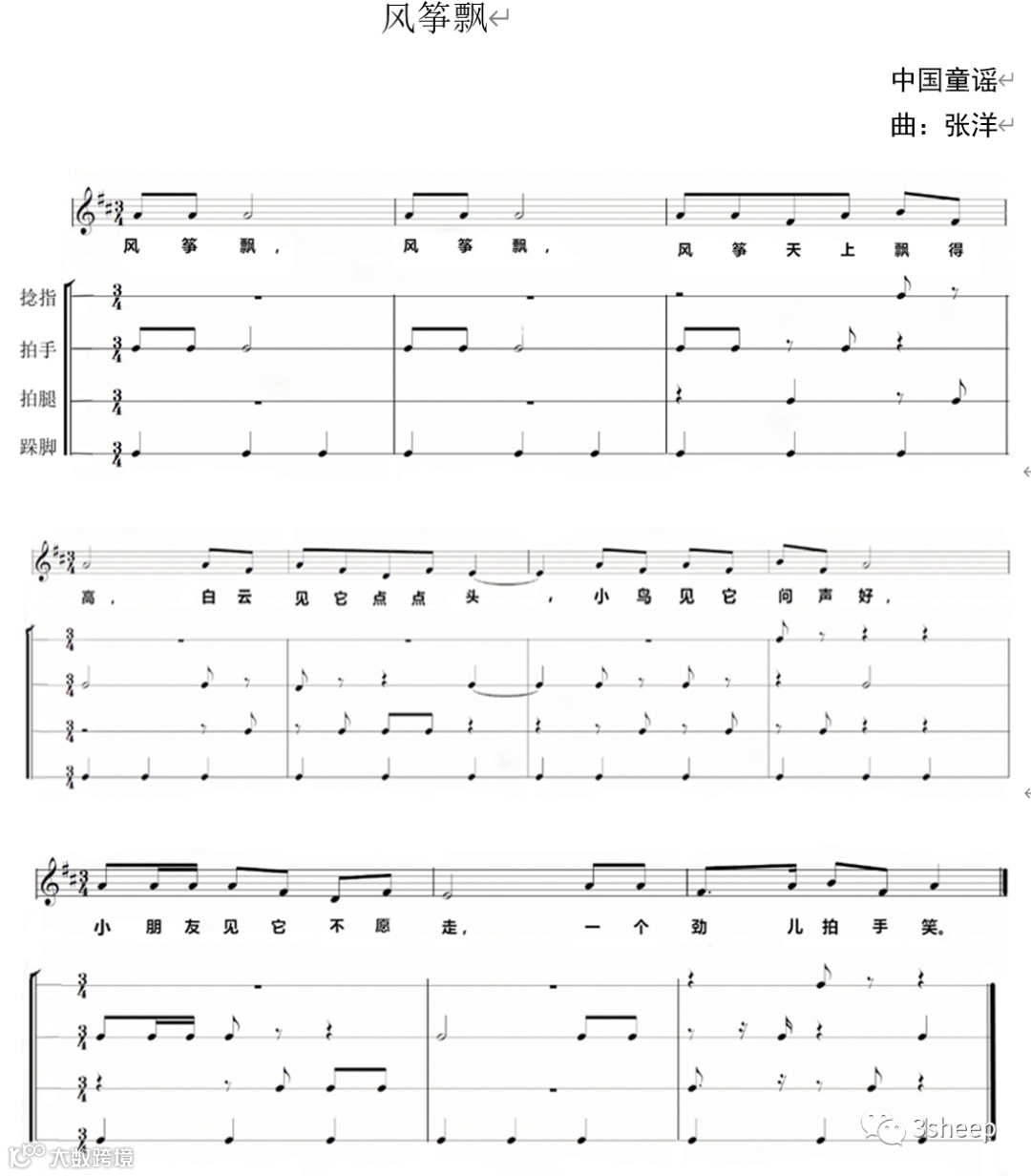 该作品(谱例3-8)是在模块二“歌唱与合唱”(谱例3-6:歌曲《风筝飘》五线谱)的基础上进行创编,加入“声势”教学部分。