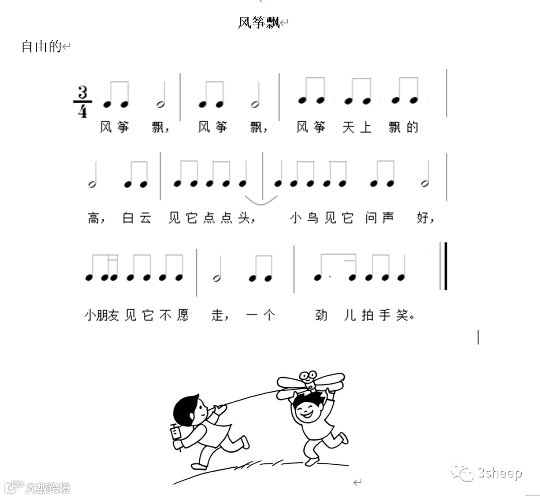 在模块一、模块二中,儿童分别学习了童谣《风筝飘》和歌曲《风筝飘》,在此基础上,我们对儿童进行“音乐与动作”模块教学(见谱例3-8)。