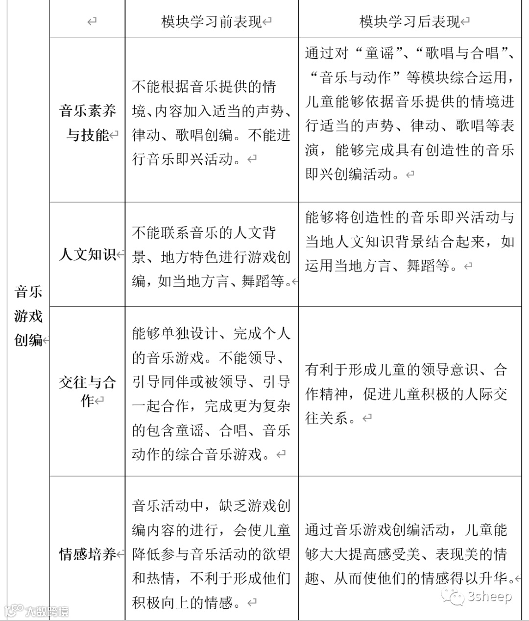 经过音乐游戏创编模块的学习,儿童在音乐素养与技能、人文知识、交往与合作、情感培养等方面都能够取得一定程度的提高,主要表现在以下几个方面(见表3-7):