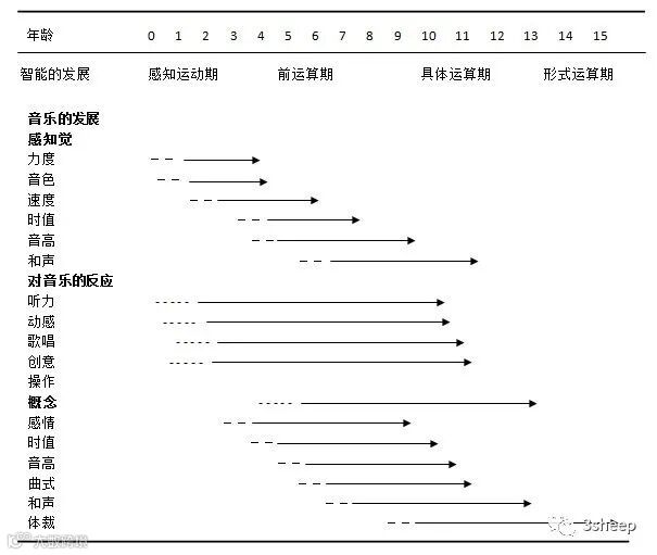 表3-1为儿童音乐发展在皮亚杰认认知发展阶段性理论中的体现。