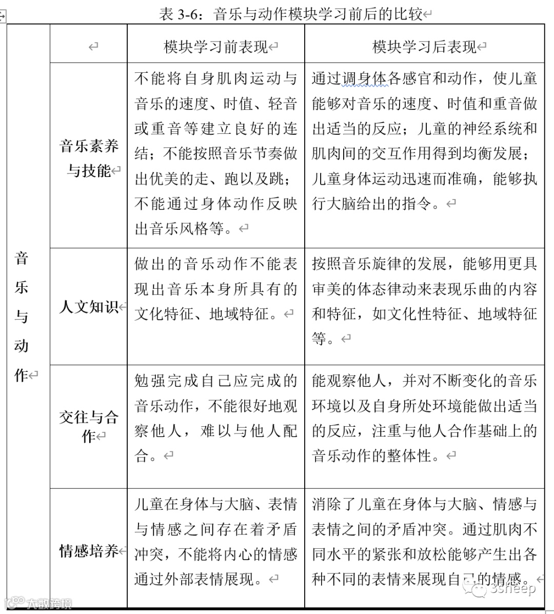 经过音乐与动作模块的学习,儿童在音乐素养与技能、人文知识、交往与合作、情感培养等方面都取得了一定程度的提高,主要表现在以下几个方面(见表3-6):