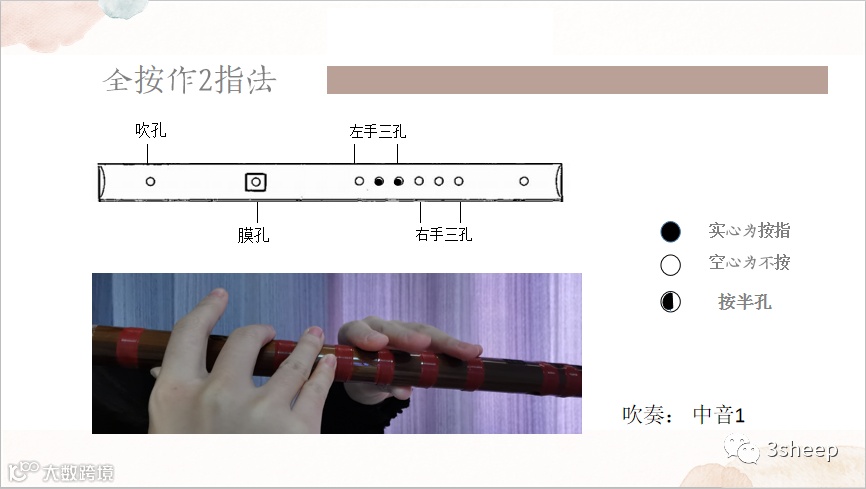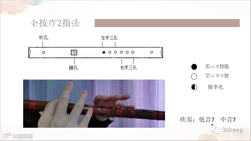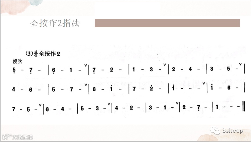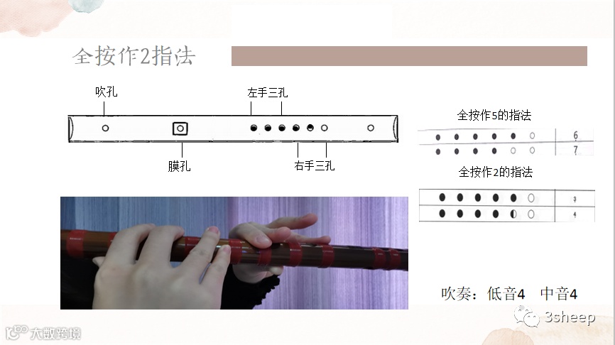 全按作2是指当六个音孔全部按严时,筒音作2。全按作2指法与全按作5的指法大致相同,只有少许变化。在吹奏半音“fa”时,可以根据音准标准,继而对手指半开孔的大小进行相应调整。