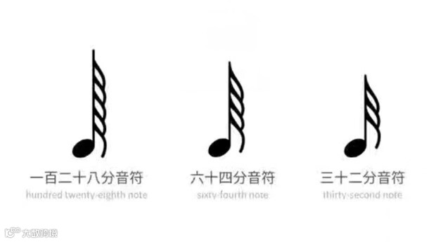 十六分音符可以继续划分成三十二分音符、六十四分音符、一百二十八分音符等。