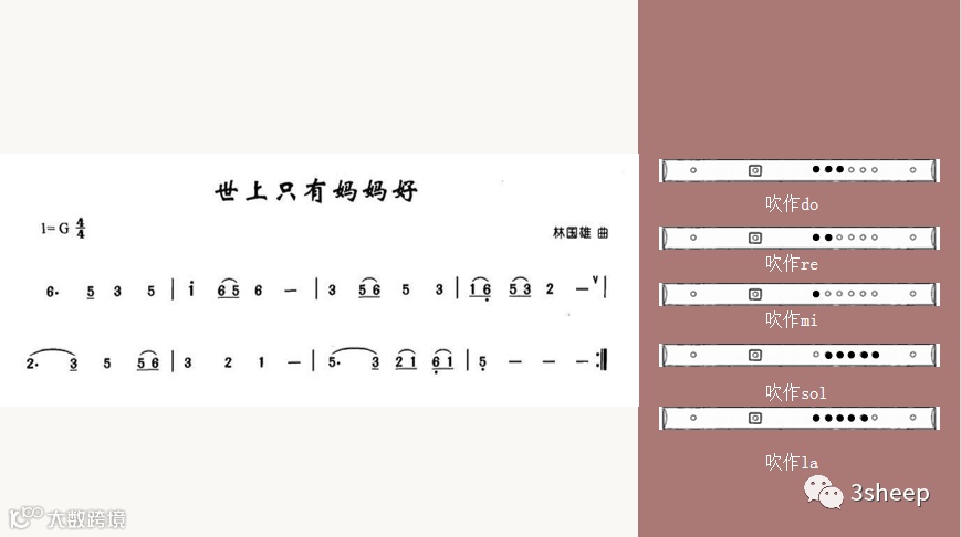 我们现在来看下曲子中具体的节奏。该作品是由二八节奏,四分音符,附点节奏组成。这些节奏型都十分简单,我先给大家范唱一下前半部分的节奏。这首作品还需要注意吹奏高音do与中音do时指法相同,但运气方法应稍有变化。高音do用“急吹”,中音“do”用缓吹。接下来,我给大家进行一个简单的示范。
