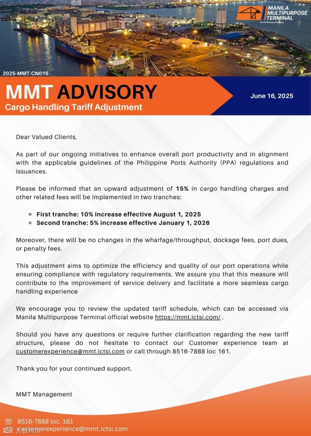 自2025年8月1日起,Manila Multipurpose Terminal将对卸货费用进行涨价: