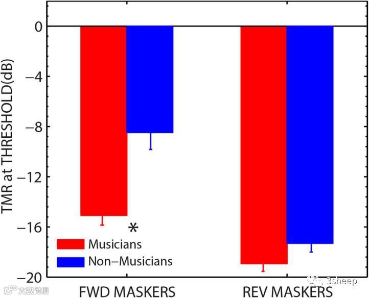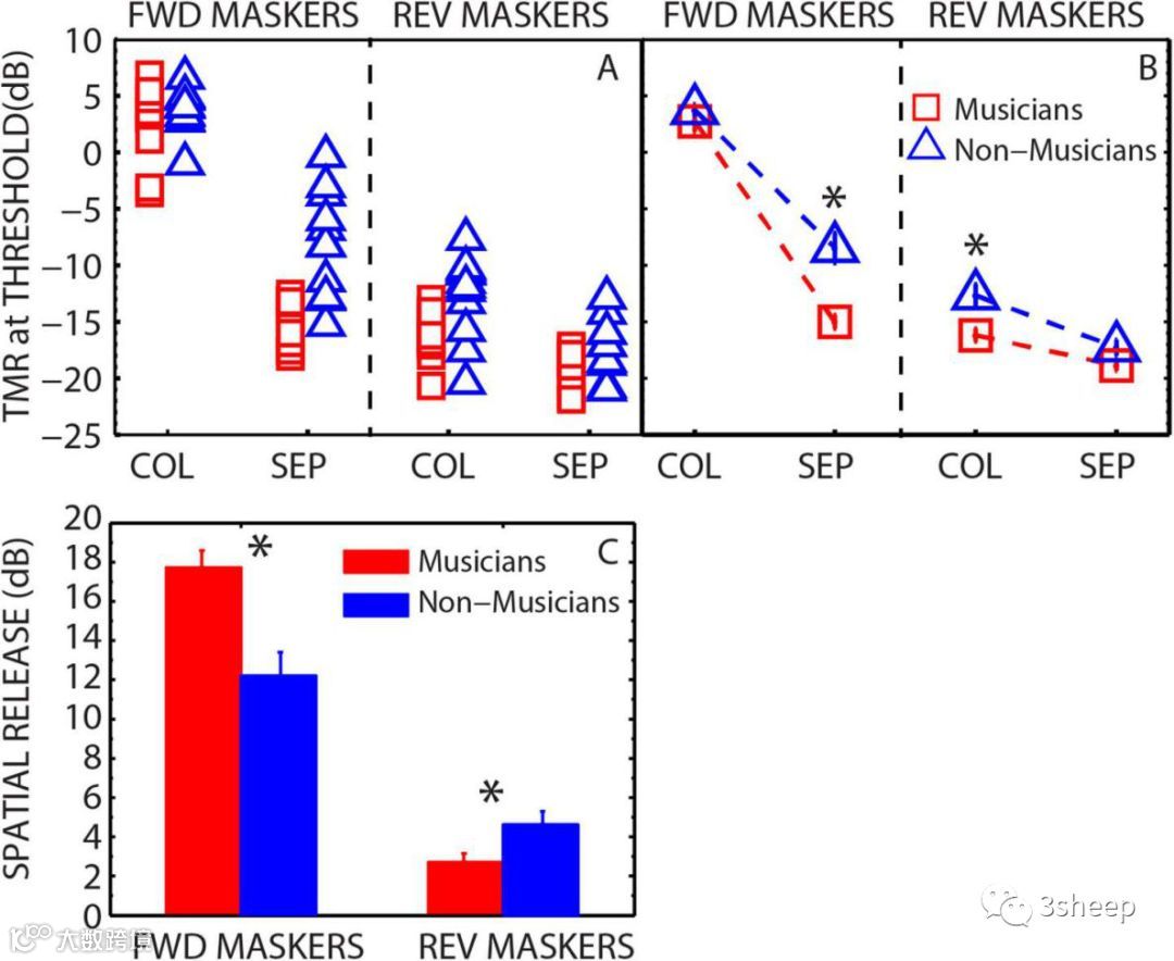 上图显示了针对个体受试者(面板A)和音乐家(面板B)的组均值(面板B)在阈值处的目标-掩模比率(TMRs)(以目标层减去分贝中的掩模层计算)。