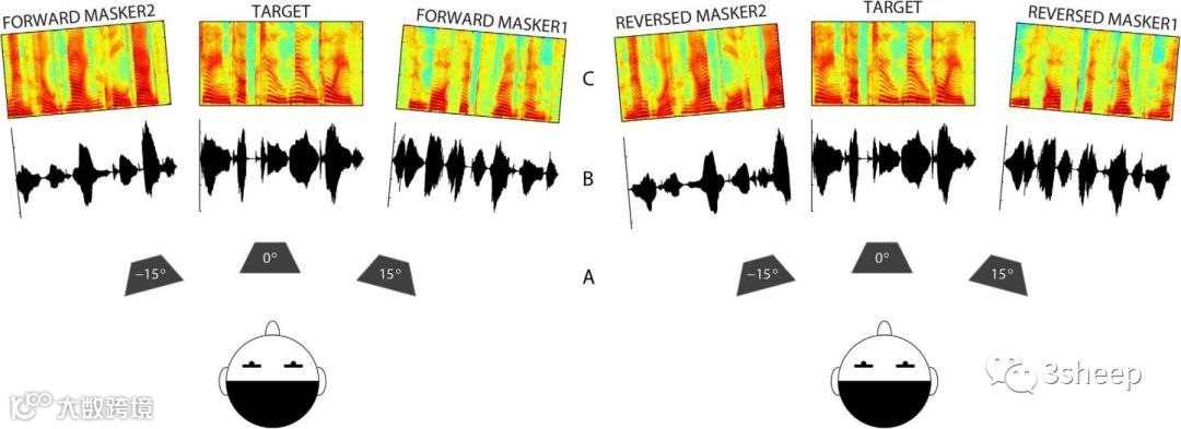上图所示。A:扬声器位置相对于听众;B&C:目标和掩模波形示例前言和反语的光谱图。目标:“简拿了两个新玩具”;前排干扰者1:“Sue买了6支红笔”;前排干扰者2:“琳恩拿了九个冰袋”。