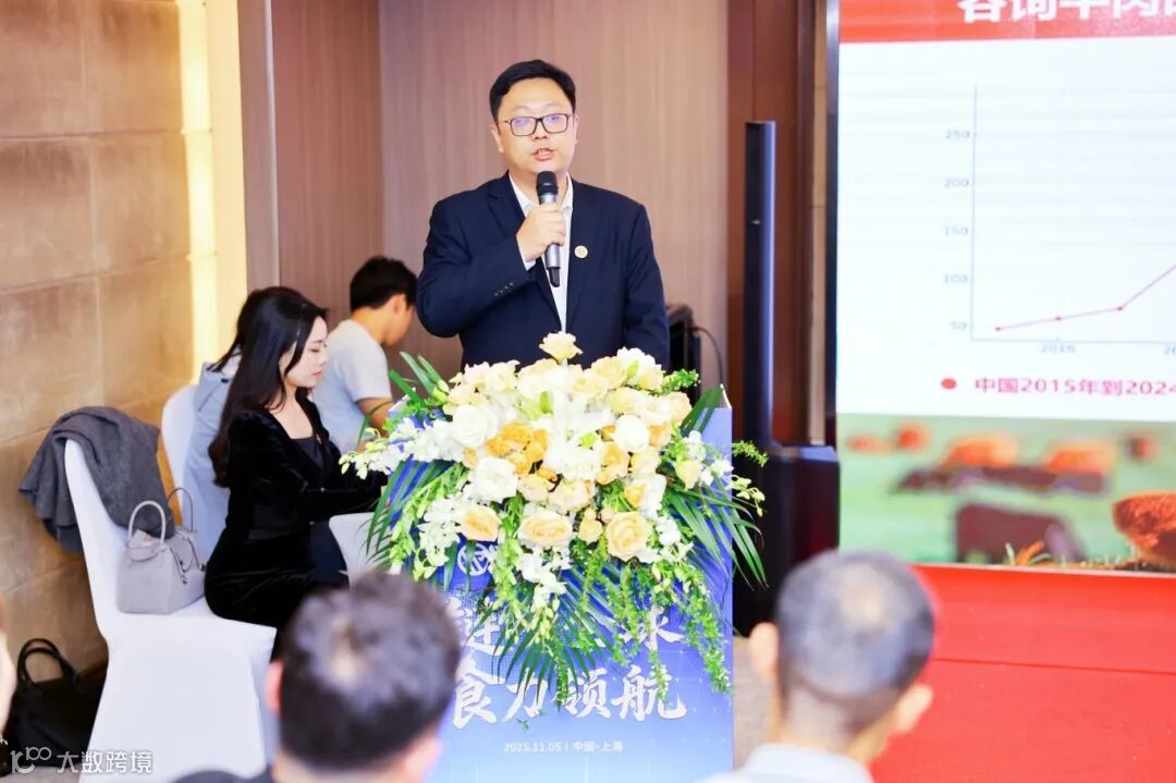 华沛商贸物流集团常务副总经理彭海峰发表开场致辞。他表示,当前,进口牛肉行业正处于机遇与挑战并存的关键发展阶段。华沛秉持 “买全球 惠全国”的使命愿景,积极拓展全球业务版图,同时精准洞察行业趋势,以长远战略眼光开辟高端谷饲牛肉赛道,将海外优质资源引入国内,填补高端消费缺口的同时,依托国内庞大市场为海外伙伴提供稳定销路,最终在实现多方互利共赢的基础上,为进口牛肉行业高质量发展注入新活力、开辟新空间。他强调,在全球经济一体化的大背景下,在消费升级的大趋势下,只要大家携手并肩、优势互补,就一定能够在进口肉类行业的发展浪潮中把握先机,共同开创合作共赢的新篇章。