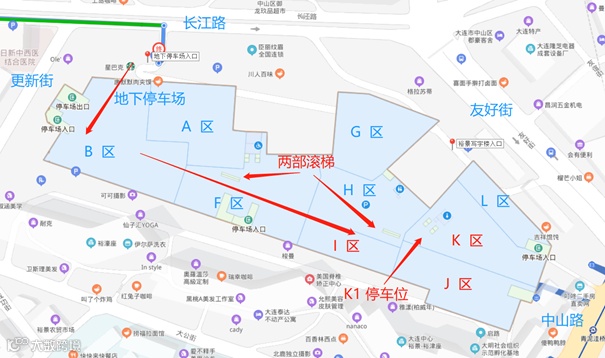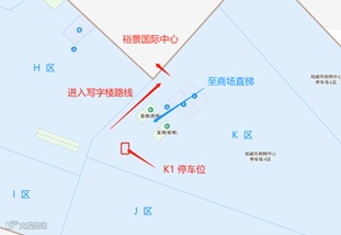 停好车后,请步行找到K1停车位,并沿K区和H区的墙壁前行(红色箭头路线),看到“裕景国际中心”灯匾,然后左转进入“裕景国际中心”区域。