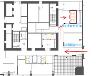 继续沿下图红色箭头行进,找到所示两部直梯,从B3升至1楼大堂。