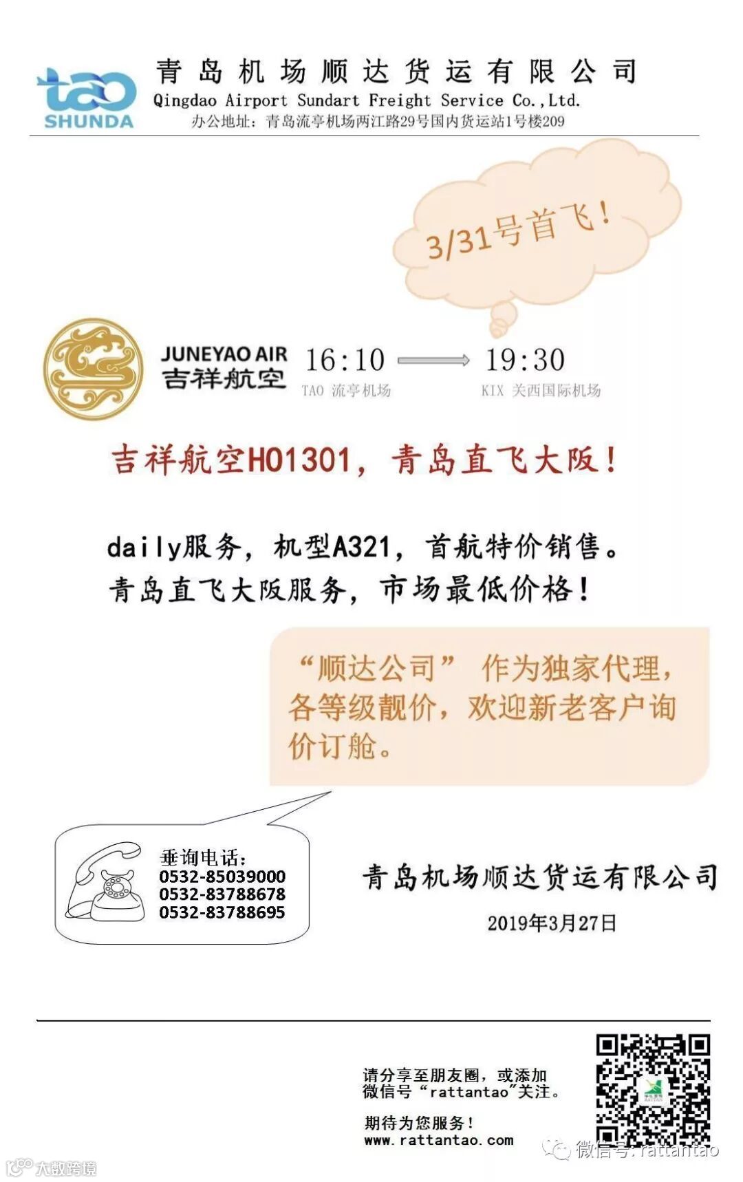 机场顺达——3月31日青岛直飞大阪,首飞亮相!