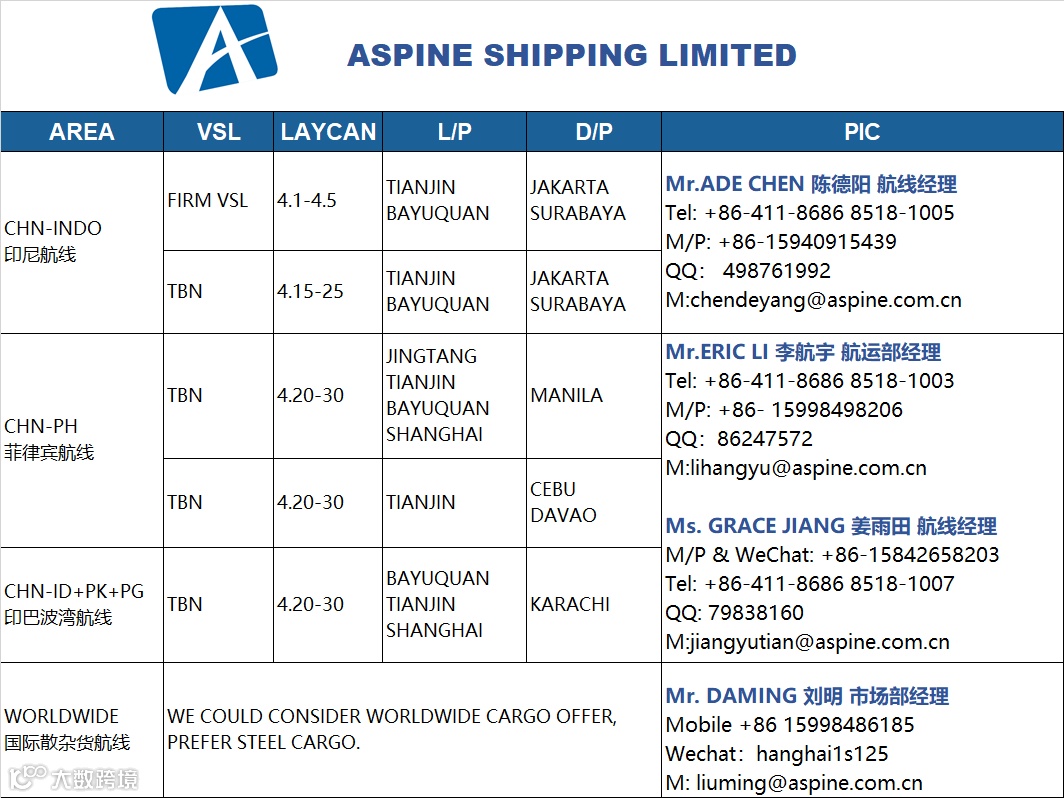 4月份印尼/菲律宾/印巴波湾欢迎联系各航线负责人订舱: