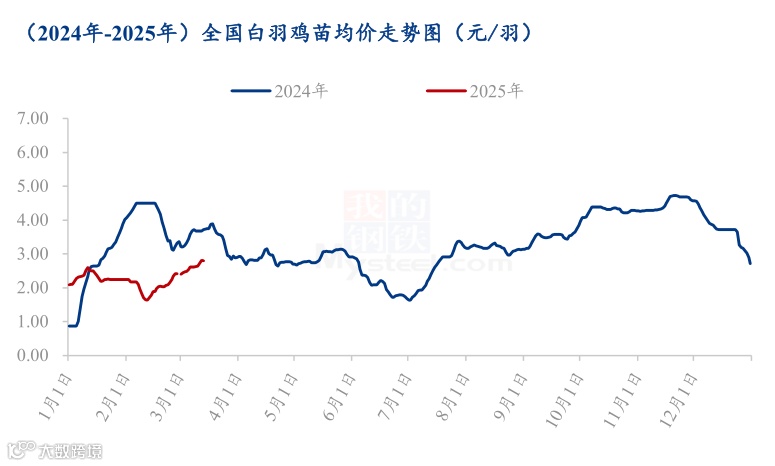 本周白羽鸡苗均价 2.69 元/羽,较上周均价上调 0.21 元/羽,环比涨幅 8.47%,同比跌幅 27.10%。周内鸡苗价格震荡上涨。原因一是毛鸡价格上涨,给鸡苗价格的上涨起到支撑作用;原因二是毛鸡价格涨后部分养殖开始盈利,补栏积极性提升;原因三是养殖端现在补栏对应“五一”前毛鸡出栏,需求较好;原因四是中大型种禽企业在此阶段排苗计划紧张,龙头企业拉涨苗价。但是当前毛鸡处于断档期,价格进行上调,个别养殖端担心毛鸡价格的持续性,控制成本较重,叠加后续养殖难度较大,鸡苗价格涨幅受限。