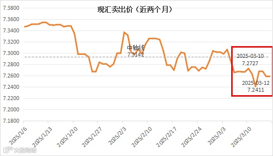 2025年第11周,周中最低7.2411,最高7.2727;周均价7.2614,与第10周均价7.2797,相较下降0.25%;2025年3月截至自前平均现汇卖出均价7.2745,环比下降0.32%,同比上升0.73% 。
