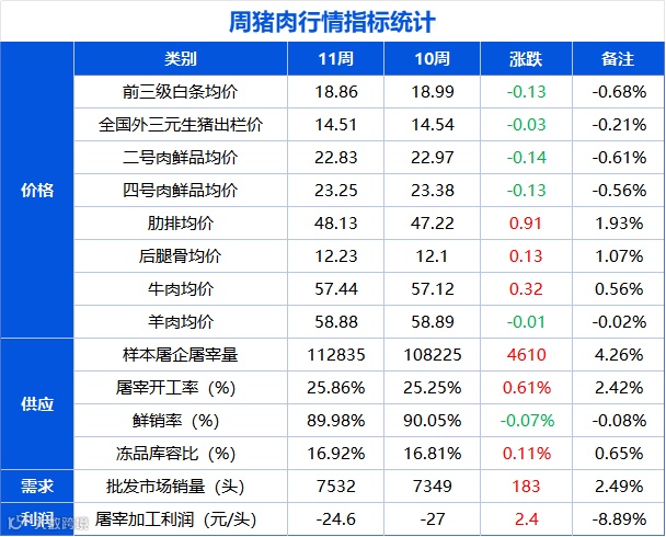 第12周全国白条均价18.86元/公斤,较上周价格走低0.13元/公斤,环比降幅0.68%,同比微涨2.22%。周内,白条价格震荡走高,但由于周初价格偏低,故而周均价格重心仍向下微移。