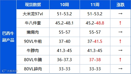 截至3月14日,Marfrig三大厂件套均价为46.0元/kg,较上周上升0.7元/kg;JBS件套均价为47.9元/kg,较上周上涨了0.3元/kg。