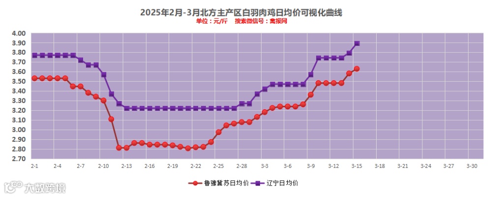 山东地区:1、社会鸡明面报价上涨5分,在3.60元/斤水平上下,局部有加价,主流维持在3.60-3.70元/斤区间上下;2、断档期到来,多地收购社会鸡缺口增大,养户压栏情绪增强,加价也做不到满宰;3、毛鸡价格逼近或超过宰杀利润盈亏平衡点,库存水平偏高,屠宰厂宰杀积极性不高,多有减产或停产;4、当前合同价格基本在3.60元/斤上下;5、屠宰多点近两天尝试提升冻品价格,但是上涨后走货不快;6、当前多点补栏保底合同价格3.45-3.50元/斤区间上下。