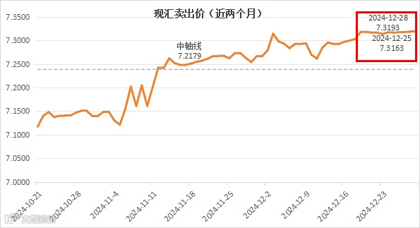 2024年第52周,周中最低7.3163,最高7.3193。周均价7.3174,与第51周均价7.3101,相较上升0.10%。2024年12月截至自前平均现汇卖出均价7.3002,环比上升1.07%,同比下降2.76%。