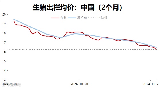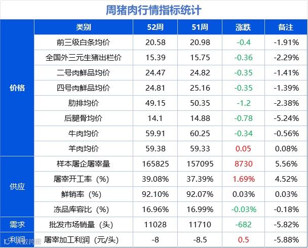 52周全国白条均价20.58元/公斤,较上周下调0.40元/公斤,环比跌幅1.91%,同比上涨9.76%。周内全国白条价格先跌后涨,但前期价格偏低,故而周均价格呈现下移。