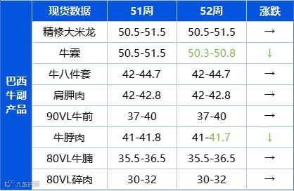 周内各产地大多数部位盘面价企稳。以巴西现货为例,如巴西前件套、牛腩、前部位单品、牛腱等与上周五价格持平,其中前8件套稳定在42-44.5元/公斤,主流价在42.5元/公斤左右,极少数如后部位肉、牛前牛后、西冷眼肉价格出现0.5元/公斤跌幅,其中大米龙97VL整体跌至49.5-51.5元/公斤主流在50元/公斤:牛霖97VL/去盖针扒价格稍低,整体集中在49-50.5元/公斤,主流在49.5元/公斤。