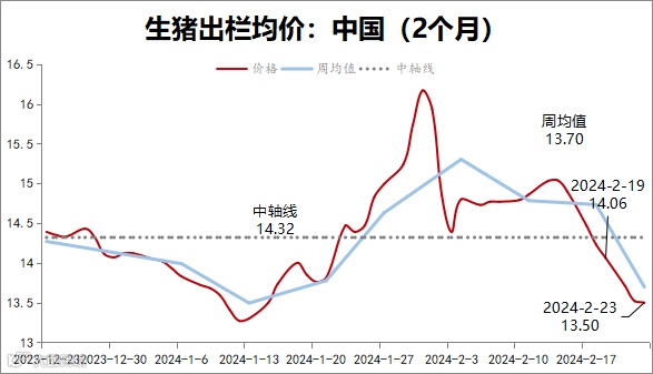 2024年第8周全国生猪出栏均价在 13.70 元/公斤,较前一周下跌 1.03元/公斤,环比下跌6.99%,同比下跌 8.74%。周内猪价震荡下行,年后试探性调涨收效甚微,此后弱势下行,周度重心跌幅明显。