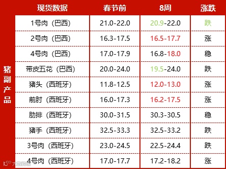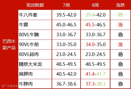 第8周进口牛肉市场,巴西美金报盘情况件套4550-5100,后部位5200-5500,牛腩3600-4400。目前国内现货市场仍多持悲观情绪,加上候补待开关国家及工厂将获得准入资质,短期内市场向上动力和预期不足。