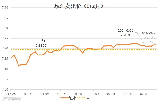 2024年第8周,整周现汇卖出价数据来看,人民币汇率基本企稳,起伏并不大,周中最低 7.2076,周末上升至最高 7.2176,周均价 7.2131,比第 7 周均价 7.2209 下降0.11%。截止 2 月 25 日,2 月均价 7.2144,较2024年1月均价7.1868上升0.0276,环比上涨0.38%。