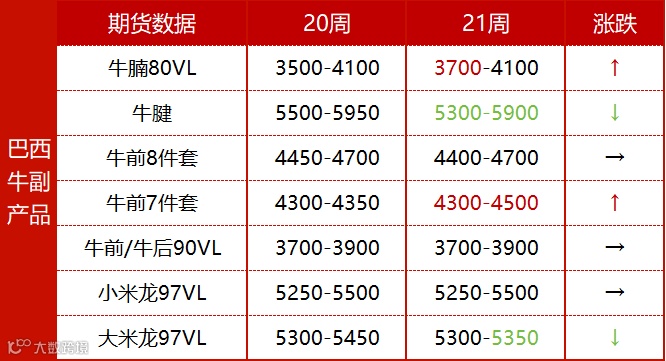 2024年第21周,本周现货价格整体保持弱稳运行。本周巴西现货主流价均企稳,少数部位偏低价格有所下行,如前8件套多集中在38-40元/公斤,主流价稳定在38.5元/公斤,周后期出现少数37.5-38元/公斤之间的报价,巴西大米龙97VL仍集中在46-48元/公斤,主流稳定在47元/公斤。
