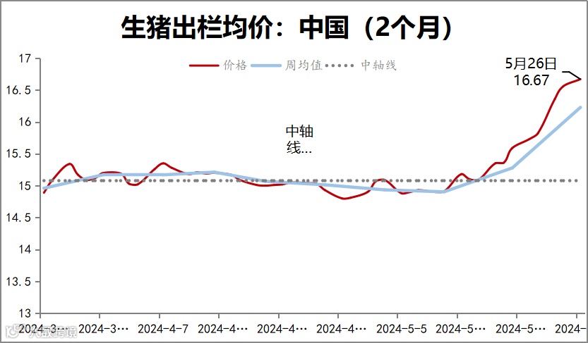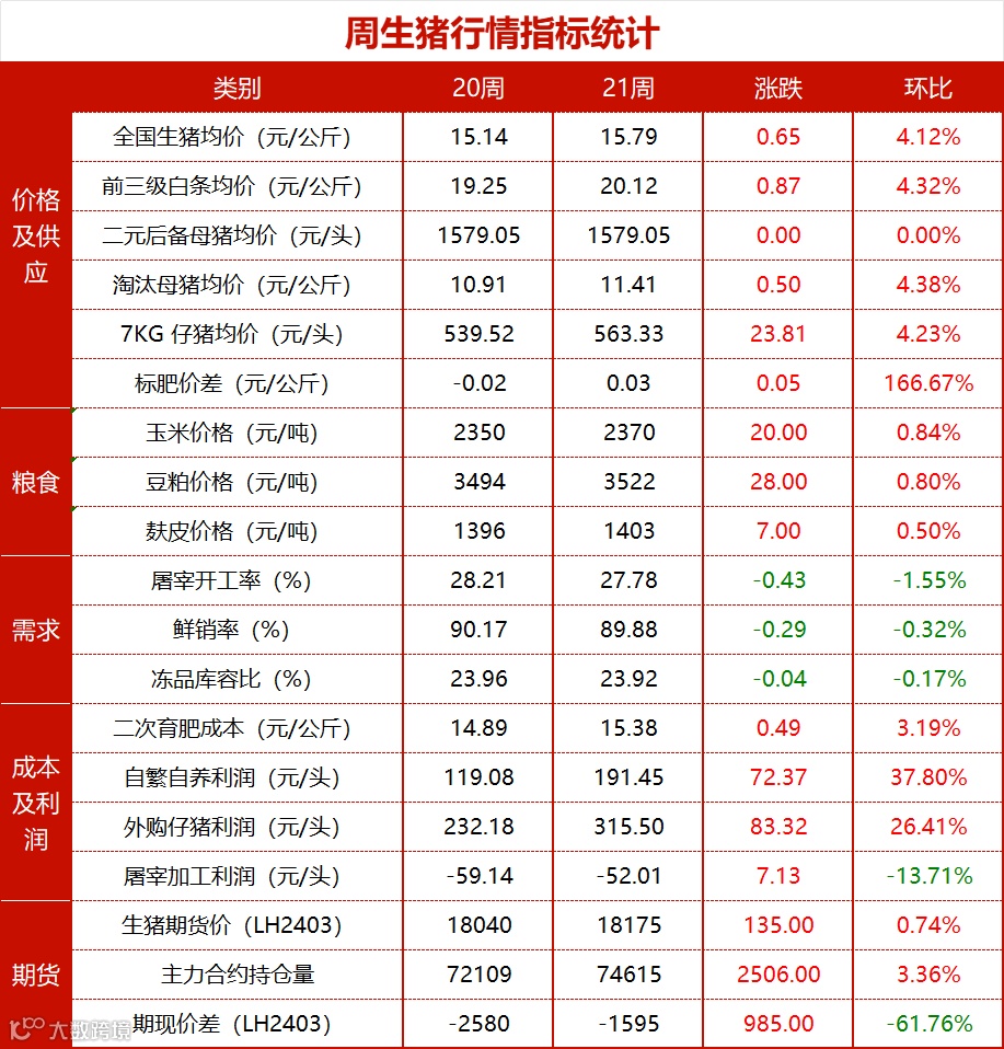 2024年第21周本周全国生猪出栏均价在 16.23元/公斤,较上周上涨 0.95 元/公斤,环比上涨 2.01%,同比上涨 7.49%。本周猪价上涨幅度较大,主要在于养殖端看涨情绪浓厚,散户压栏惜售,集团缩量挺价出猪以及二育进入的刺激下,致使情绪达到高涨,猪价上涨。