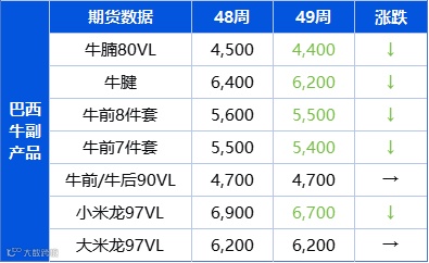 第 49 周进口牛肉现货市场成交不佳且价格下跌,终端需求未好转,需求商出价走低,持货商因年底出货时间缩短而报盘积极致报盘量充足,现货成交价下行,多数部位盘面价有跌幅,部分部位持稳但成交在低价区间;期货市场报价下跌且成交僵持,巴西工厂报盘积极且盘量增大,阿根廷和乌拉圭工厂盘量无明显变化,船期集中在 12/1 月,巴西期货盘面价整体较上周下跌 100 - 200 美元 / 吨,因工厂多且定价差异大,各部位报价混乱。