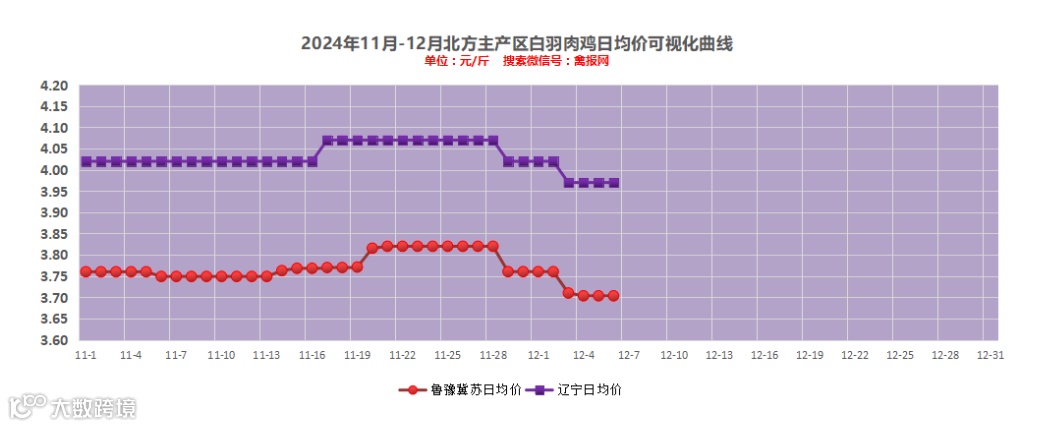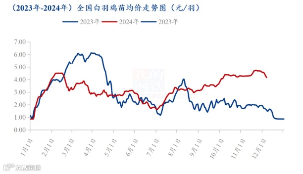 49周白羽鸡苗均价为 4.49 元/羽,较上周均价下调 0.20元/羽,环比跌幅 4.26%,同比涨幅 152.25%。本周白羽鸡苗格呈连续下滑趋势,苗价持续下滑的原因:一是养殖端本周补栏对应的毛鸡出栏时间临近屠宰企业“春节”放假时间,补栏群体多以规模化养殖场及集团自养场为主,市场散户补栏情绪明显降低;二是毛鸡价格下滑,出栏毛鸡呈现亏损,养殖端下压鸡苗价格呈现渐增;三是临近“停苗期”,市场开始出现临时计划,种禽端有意稳定预排计划,挺价意愿降低。多重影响下,利空因素占主导,苗价连续下行。